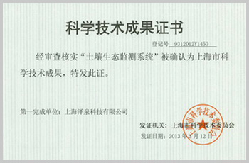上海市科技成果證書——土壤生態(tài)監(jiān)測(cè)系統(tǒng)