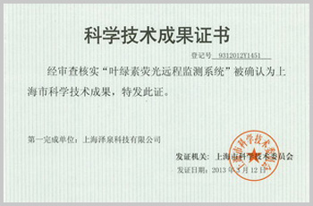 上海市科技成果證書——葉綠素?zé)晒獗O(jiān)測(cè)系統(tǒng)