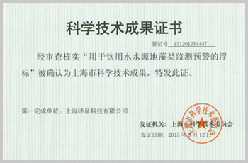 上海市科技成果證書——飲用水源地預(yù)警浮標(biāo)