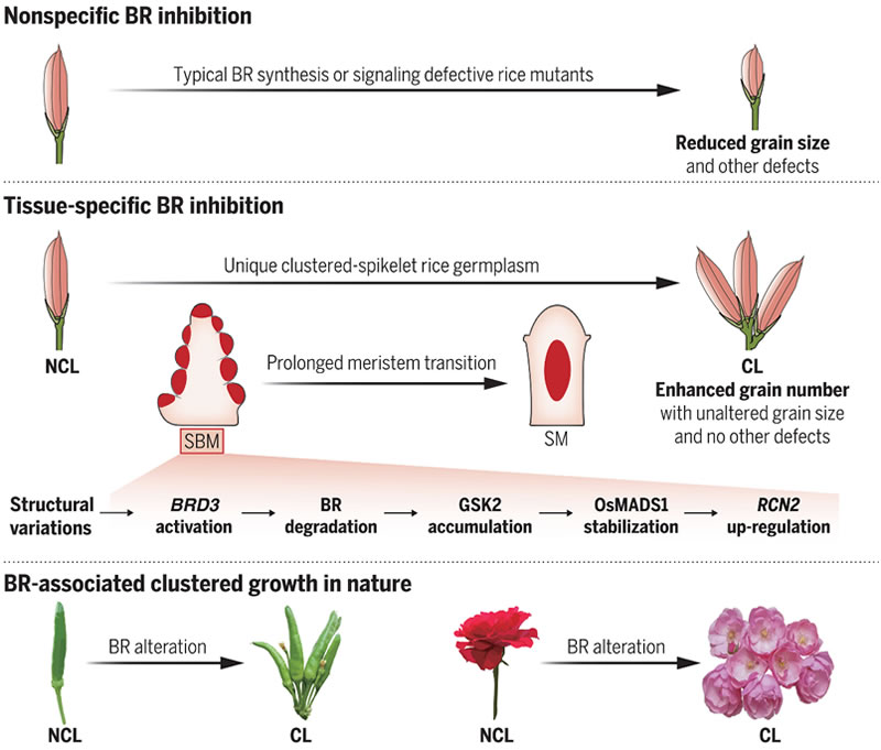 本文破譯了復粒稻多粒簇生形成的機制,發(fā)現(xiàn)了控制簇生形成的基因編碼植物激素油菜素甾醇(BR)的代謝基因,解析了激素信號通路如何以精確的時空方式作用以提高水稻的籽粒數(shù)。