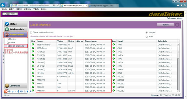 具有測(cè)量模擬量、數(shù)字量、高速計(jì)數(shù)器輸入量、相位編碼器輸入量和可編程串行數(shù)據(jù)量的傳感器通道,因此可簡(jiǎn)單、直接的連接多種不同形式的傳感器和數(shù)據(jù)測(cè)量裝置。AgriPhenoCloud DT80可用于采集溫度、電壓、電流、4-20mA回路電流、電阻、電橋、應(yīng)變儀、頻率、數(shù)字,或連接智能傳感器進(jìn)行數(shù)據(jù)采集,同時(shí)可對(duì)采集到的不同原始數(shù)據(jù)進(jìn)行計(jì)算,按所需要的工作單位或統(tǒng)計(jì)報(bào)告的形式將原始數(shù)據(jù)或計(jì)算結(jié)果返回到上位機(jī)。通過計(jì)劃設(shè)置實(shí)現(xiàn)分組采集、數(shù)據(jù)記錄、報(bào)警設(shè)置和控制作業(yè)以滿足不同的測(cè)量要求。智能傳感器、GPS、PLC和其他智能裝置可通過DT80的兩個(gè)串行傳感器接口(RS232或RS422、485)進(jìn)行連接??蛻艨蛇x用 dataTaker的CANgate與DT80連接,實(shí)現(xiàn)CAN總線監(jiān)測(cè)及數(shù)據(jù)采集。
