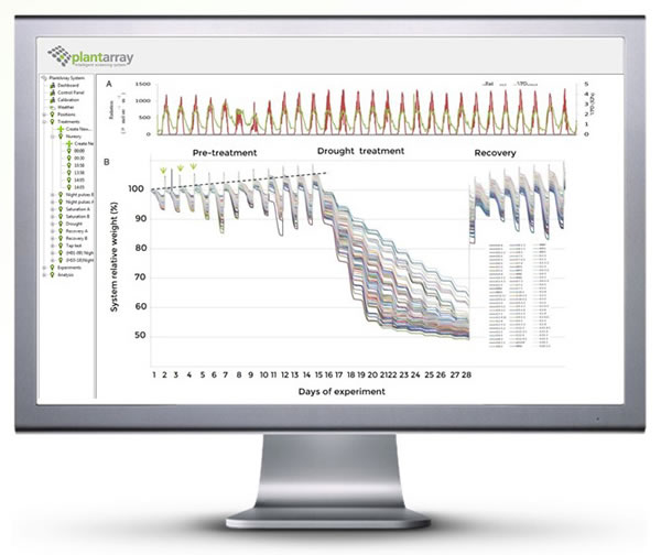 以色列Plant-DiTech公司的Plantarray監(jiān)測系統(tǒng)是一套高通量,以植物生理學(xué)為基礎(chǔ)的高精度表型系統(tǒng),可以完成整個植物生長周期中不同環(huán)境下的SPAC(Soil-Plant-Atmosphere Continuum, 土壤植物大氣連續(xù)體)因子的測量。連續(xù)不間斷的獲取陣列內(nèi)所有植物的監(jiān)測數(shù)據(jù),實時監(jiān)控和及時調(diào)整每個培養(yǎng)容器中的土壤條件,包含土壤水分、鹽分。