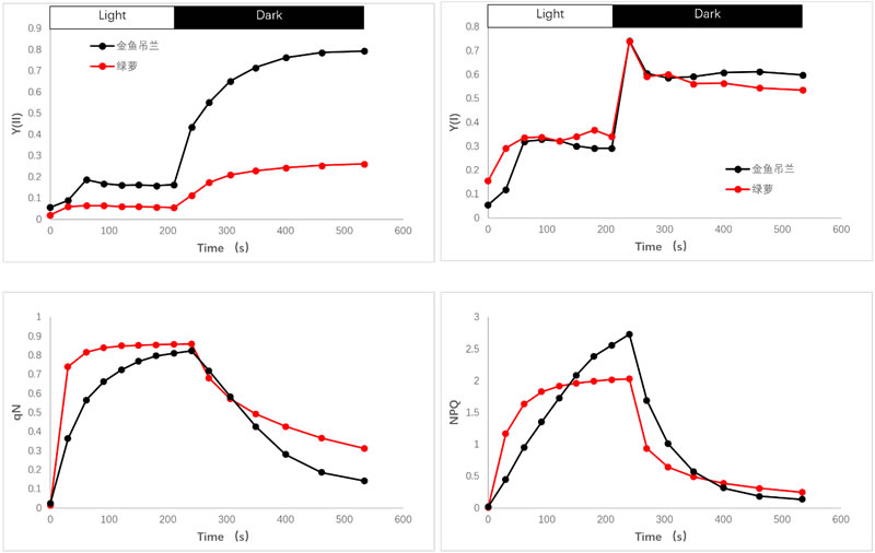在非光化學(xué)淬滅方面,衰老綠蘿葉片表現(xiàn)出極高的NPQ和Y(NPQ)。弱光(60 μmol·m?2·s?1)照射便能誘導(dǎo)綠蘿葉片出現(xiàn)顯著NPQ峰值(約2.028),而金魚(yú)吊蘭葉片NPQ在強(qiáng)光750 μmol·m?2·s?1下才達(dá)到類似水平。這表明衰老葉片中的熱耗散機(jī)制極度活躍,弱光便可高度激活。綜合而言,衰老葉片吸收的光能主要通過(guò)NPQ強(qiáng)力耗散,而光化學(xué)轉(zhuǎn)化大幅削弱。
