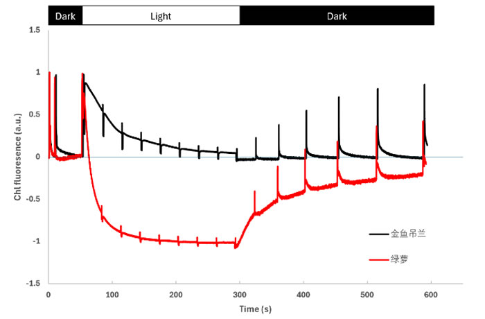 如圖1所示,綠蘿衰老葉片與金魚(yú)吊蘭健康葉片在照光初期的熒光動(dòng)力學(xué)存在較大差異。在綠蘿衰老葉片中,照光后Fs快速下降,并顯著低于暗適應(yīng)初始熒光Fo,其最低值約達(dá)到歸一化后-Fm的水平。暗馳豫過(guò)程中,F(xiàn)s逐漸回升,但在觀察時(shí)間內(nèi)仍未恢復(fù)至Fo水平。相比之下,金魚(yú)吊蘭健康葉片的Fs始終介于Fo與Fm之間,基本未出現(xiàn)超過(guò)Fo的下降,僅在暗馳豫初期出現(xiàn)短暫且幅度很小的下降。這些結(jié)果表明,衰老葉片存在明顯的Fs超淬滅現(xiàn)象,其幅度遠(yuǎn)大于健康葉片的正常淬滅行為。P700?吸收動(dòng)力學(xué)可以看出,光下綠蘿衰老葉片低于金魚(yú)吊蘭健康葉片,表明其電子傳遞鏈處于相對(duì)還原狀態(tài)。