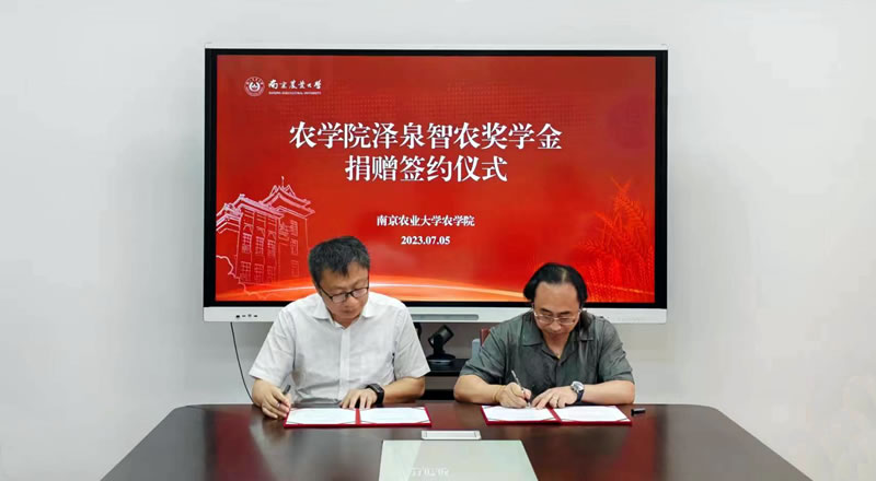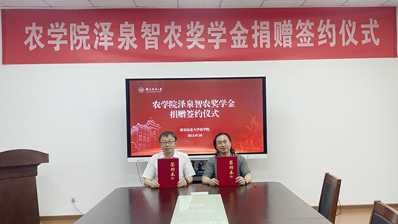 2023年7月5日上午, “澤泉智農(nóng)”獎(jiǎng)學(xué)金捐贈(zèng)簽約儀式在南京農(nóng)業(yè)大學(xué)農(nóng)學(xué)院舉行。農(nóng)學(xué)院黨委書(shū)記莊森,農(nóng)學(xué)院教授姜東,上海澤泉科技股份有限公司總經(jīng)理顧群、銷售經(jīng)理劉琦出席捐贈(zèng)儀式。簽約儀式由農(nóng)學(xué)院黨委書(shū)記莊森主持。